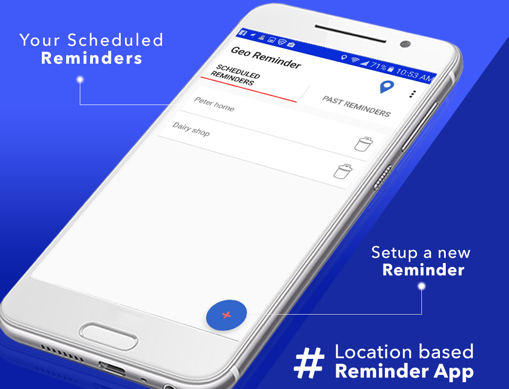 This Location based reminder app is designed to help users remember what they have to do at a specific location. To make the app convenient for our users, simplicity and easy navigation have been focused in its design. All you have to do is set a location, name it and set the type of reminders, i-e Voice reminder, SMS, Push notifications and Alarms. Also the app can be used to send a SMS message to family and friends and let them know about your location.