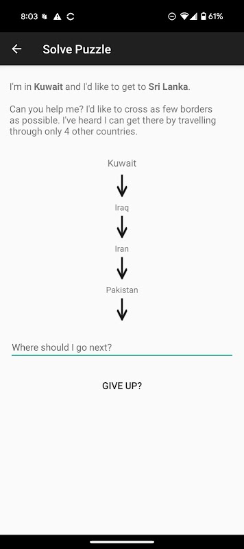 The app will ask you questions like "What's the shortest path from Spain to Germany (crossing the minimum number of borders)?" The answer is Spain -> France -> Germany. You'll start easy and progress to much more challenging questions that require you to cross multiple borders. For example, what's the shortest path from South Korea to Poland?