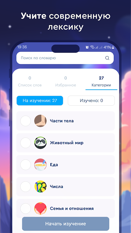 The program includes learning new words, including vocabulary by categories such as food, travel, work, family and other topics. You can add unfamiliar and difficult words to your personal vocabulary and practice new vocabulary at any time!
