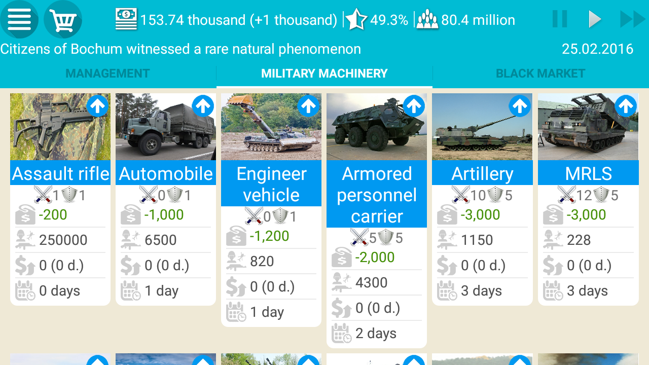 - Conduct army drills (there more than 10 kinds of military weaponry available to you).