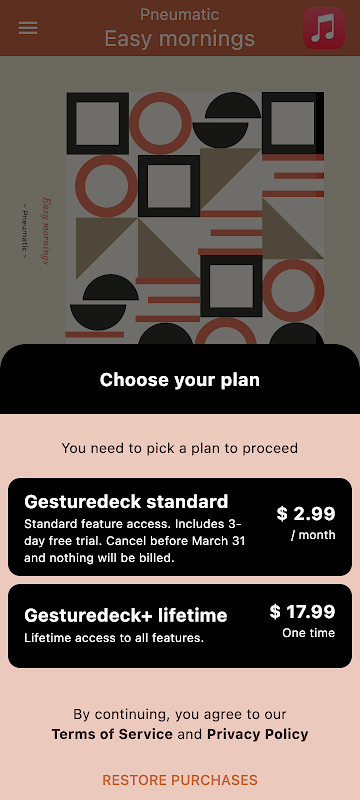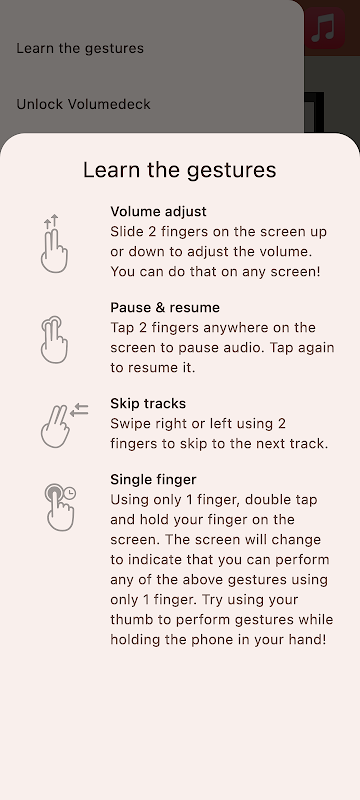 Use Gestrudeck as an overlay over any other music app! Enable "Overlay mode" in the app menu and touch gestures will always be one tap away, no matter which music app you are using!