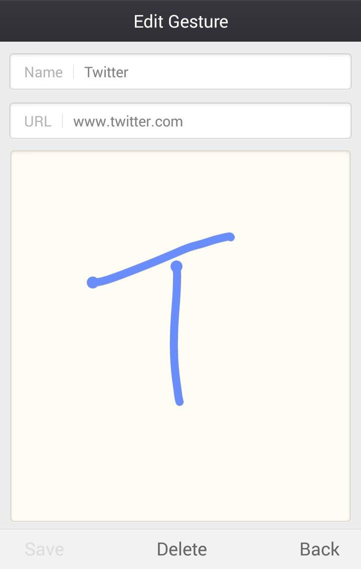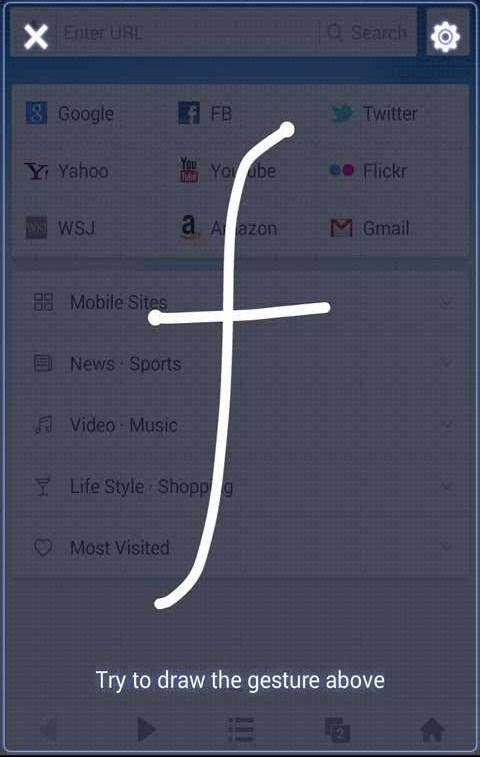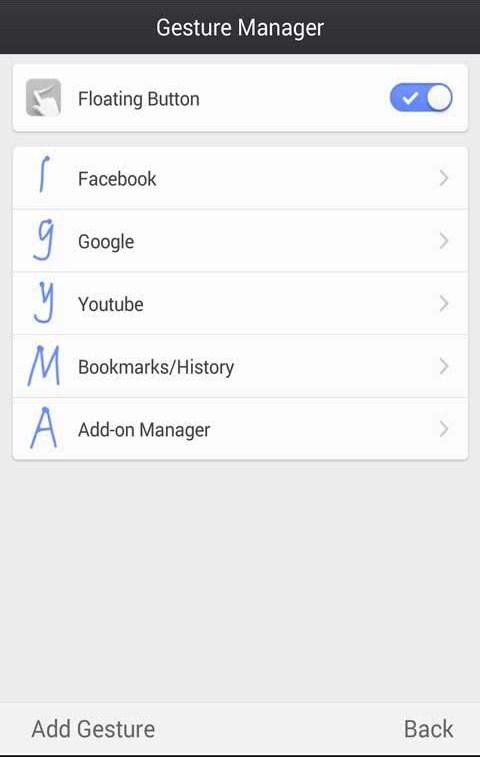 Gestures is an add-on of UC Browser that allows you to visit websites by drawing gestures on the screen. Simply add your favorite site addresses as gestures and draw these gestures to visit the sites instantly. Just like magic!