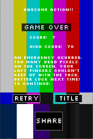 Game play: just tap those white pulsating pixels in order to destroy them. The more you destroy, the more points you get. But do it fast! That will give you even more points. If so happens that you allow 5 pixels on the screen, it's game over (not to mention Cathode Ray City will be destroyed. So, no pressure) Oh! by the way, there are certain special pixels worth 2 to 4 times more points than normal ones.