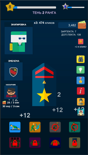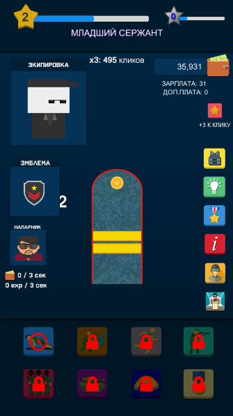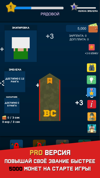 Это армия. Ты Салага... Рядовой. Трудно быть духом, это знают все без исключений. Это игра про армию и тебе придётся кликать... много кликать, чтоб повышать своё звание и полномочия. Чем выше твоё звание - тем и больше полномочий, которыми ты можешь воспользоваться для дополнительного опыта, а так же с каждым новым званием у тебя увеличивается зарплата. Деньги ты можешь потратить на экипировку, навыки, эмблему или можешь прокачать своего напарника, который обязательно тебе поможет. Зарабатывай Авторитет, поднимай свой оклад и дополнительный заработок, завоюй каждую стезю военного назначения. Будь лучшим!