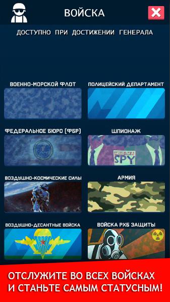 - Полноценный симулятор армии, где тебе придётся зарабатывать воинские звания непосильным трудом, зарабатывать авторитет и служить в разных войсках.