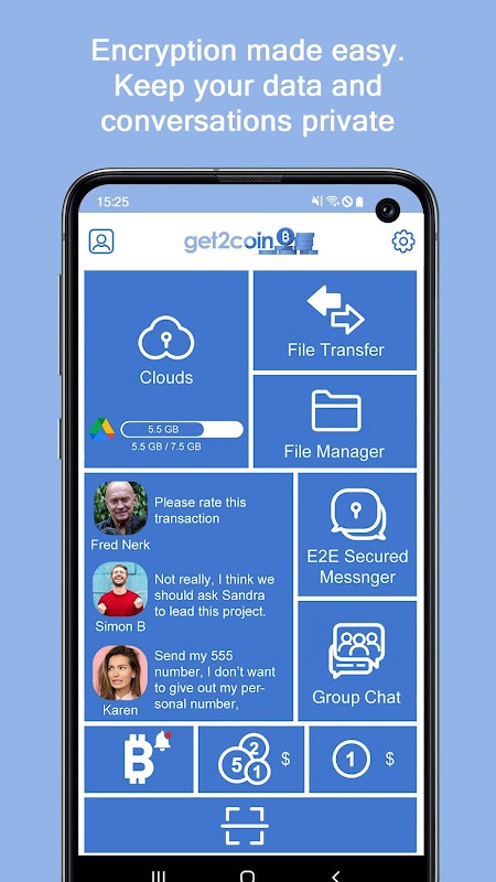 This is your new own bitcoin wallet. It combine a bitcoin wallet with a communicator. It supports all main cloud providers, use your NAS server at home, or get2coin transfer cloud for free.