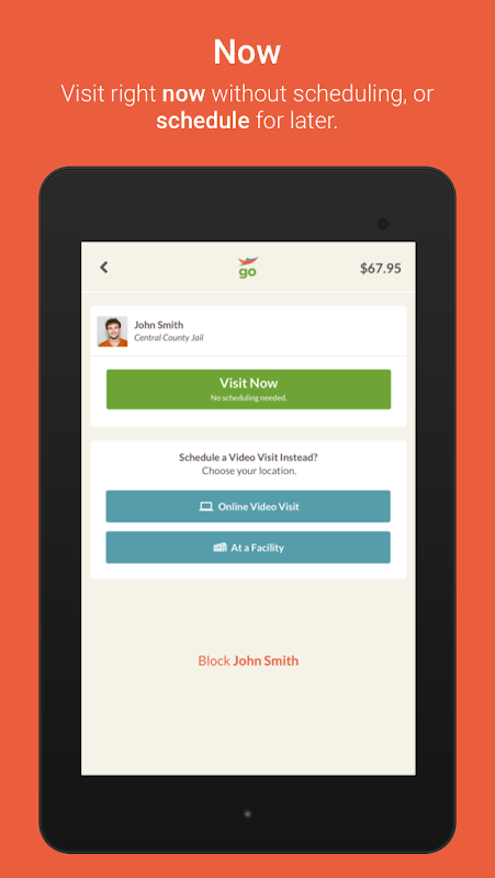 • NO SCHEDULING NEEDED: See your loved one, quicker than ever and video visit when it’s convenient for you without scheduling. The Visit Now feature lets your visit begin in minutes. If the inmate’s not available, you’ll be notified and can schedule a visit later.