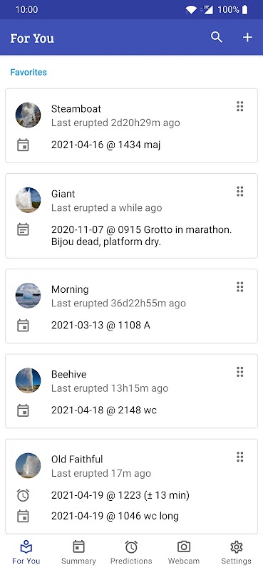 • View the latest information on your favorite geysers in a personalized for you screen.