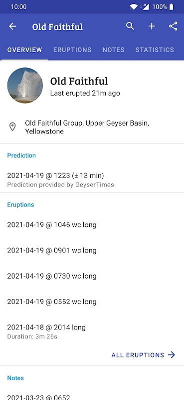 • View predictions made by GeyserTimes, which are available for additional geysers and recalculated while offline.