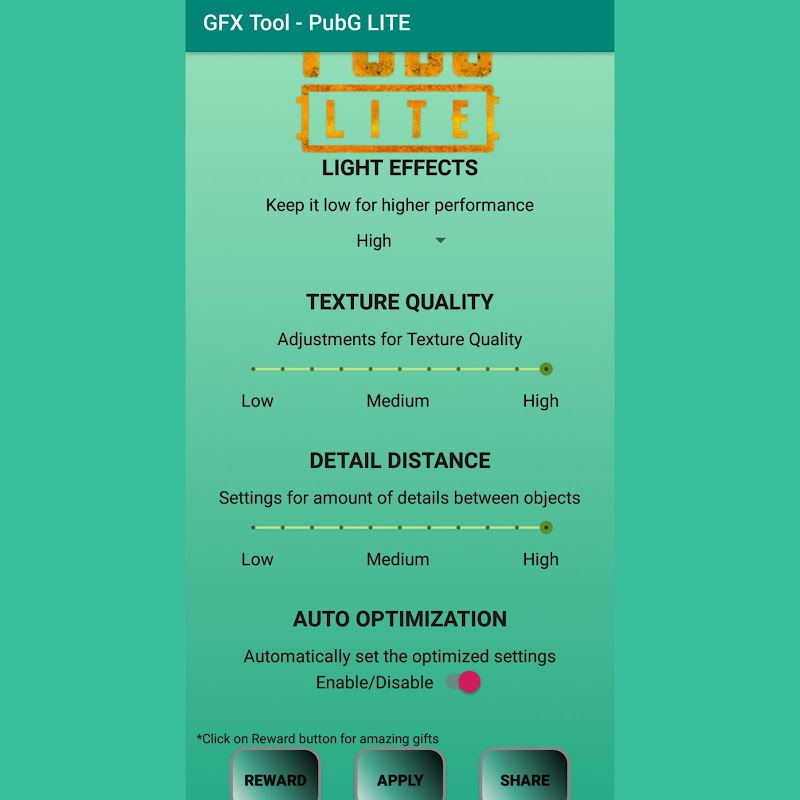 In this GFX Tool, you can either enable or disable the automatic graphics settings which shall automatically detect and set the most optimal and compatible graphics for your device and shall let you enjoy gaming without any lags.