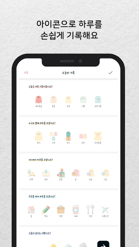 다양한 아이콘으로 누구와 무엇을 하며 하루를 보냈는지 기록해보세요. 평소에는 아이콘으로 간단하게, 소중한 날에는 사진과 함께 긴 글로 기록해보세요.
