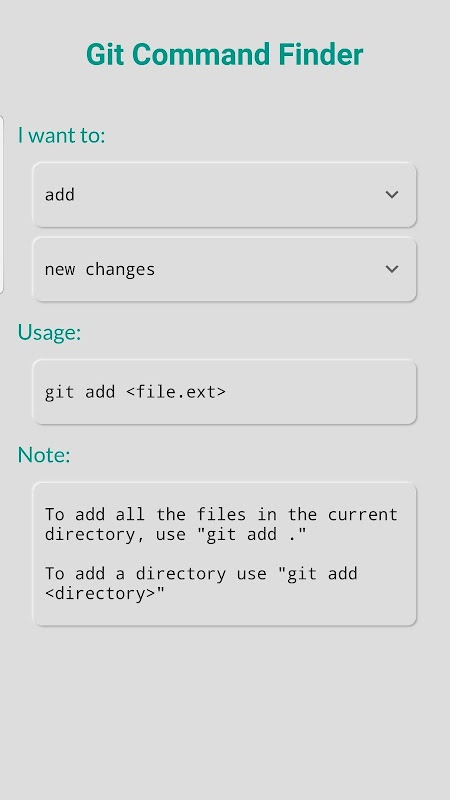 This application lets you quickly find specific Git commands you need.