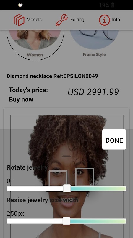 3. Align your face. The photo should like in size and alignment like the model photos for best results. Of course you can move the glasses around with fingers and increase size or rotation with the editing tools on header.