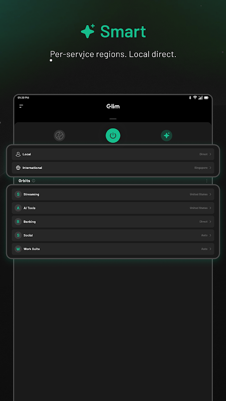 Glim is a smart-routing VPN built for everyday speed and privacy. Route only the apps and sites you choose (so local traffic stays direct and fast), or switch to full-tunnel protection when you need it—like on public Wi-Fi or while traveling.