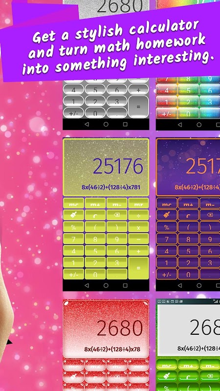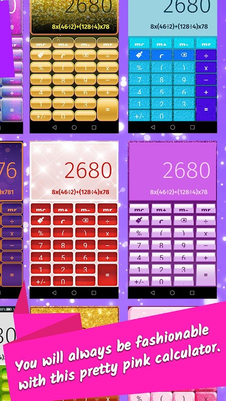 Make math fun again with Glitter Calculator - Pretty Calculator. Be stylish even when you are solving math problems with Glitter Calculator - Pretty Calculator. Get a colorful calculator with glitter and gold and be fashionable even when you practice math problems. Forget about your simple calculator, and try out Glitter Calculator - Pretty Calculator!