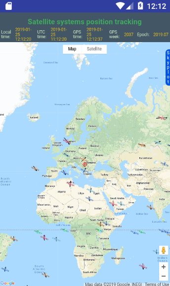 The application shows the positions of the satellite / satellites (GPS, GLONASS, Galileo, BeiDou, and EGNOS) at any given moment (in real or simulated time). Simulated time before / after 2 hours from current time.