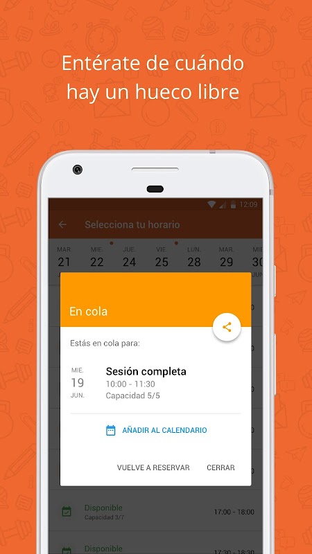 - Recibe notificaciones cuando un aparece un hueco libre en la sesión que andabas buscando.