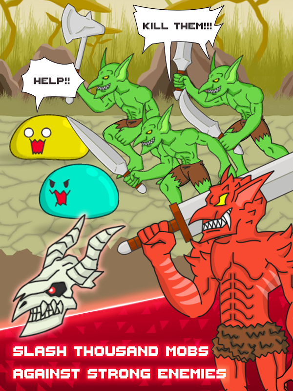 Starting off as a broken sword and then evolved to its utmost potential as an unmatched demon blade . Meet many mobs of goblins awaiting to fight you : guardian goblin , hunter goblin , or even the goblin king . They are waiting for lost adventurers to kill and devour . These monsters all want to evolve . Thus, they need a large number of knights souls and warrior souls to develop their evil powers .