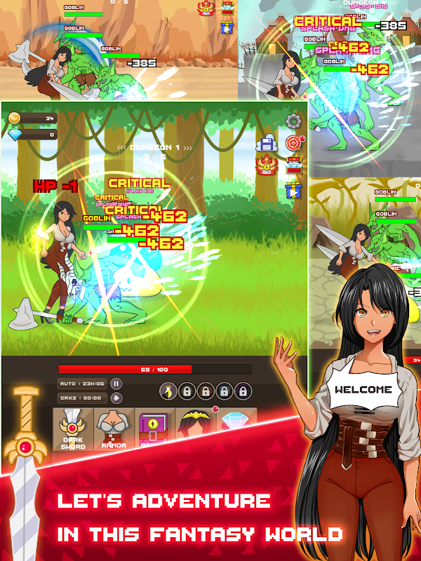 Let’s fight the evil goblins , where you play the role of a young female knight with the Dark Sword on a mission to hunt down the goblin army that terrorizes people in the dark age . From an ordinary girl transformed to a goblin slayer with idle clicker rpg gameplay , or it can be called an afk battle game . Go on an adventure and discover quest in various maps . Defeat the brutal dungeon boss . Pursue the path of the knight hero . Slay enemies and collect dark soul to awaken the power of the sword even further .