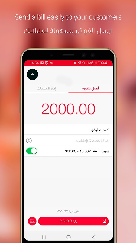 • افتح التطبيق، أدخل المبلغ المطلوب تحصيله وأنشئ الفاتورة