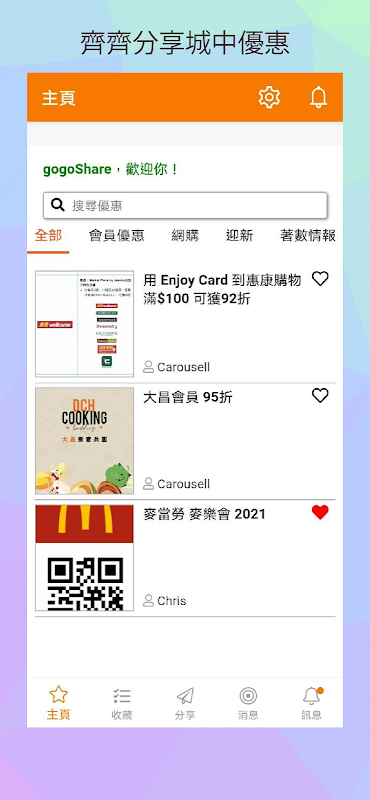 透過gogoShare一站式優惠平台,可以由用家提供同時又可獲得最新嘅優惠活動,例如:會員優惠、迎新優惠又或者網購優惠碼等等。幫助大家每一日都慳到盡!咁好嘅app即刻同朋友一齊下載啦!