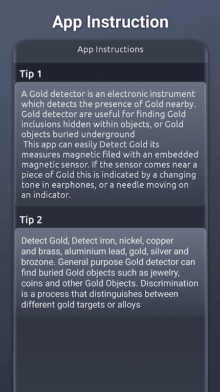 Gold detector is a handy, magnetic sensor-based app that helps you detect precious metals and minerals right on your Android phone! By using the frequency data generated by the magnetic sensor in your device, Gold Detector can identify the presence of metals like gold, silver, and platinum with ease! This app is perfect for miners, prospectors, and anyone else who wants to find valuable materials and metals!