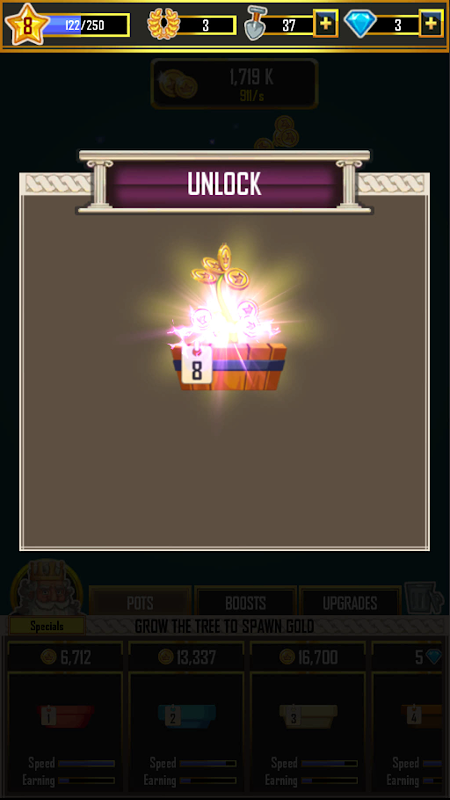 Gold Tree can go Idle! Every once in a while every pot will generate some gold. The better pots, the better tree you get. The better tree, the higher gold income!