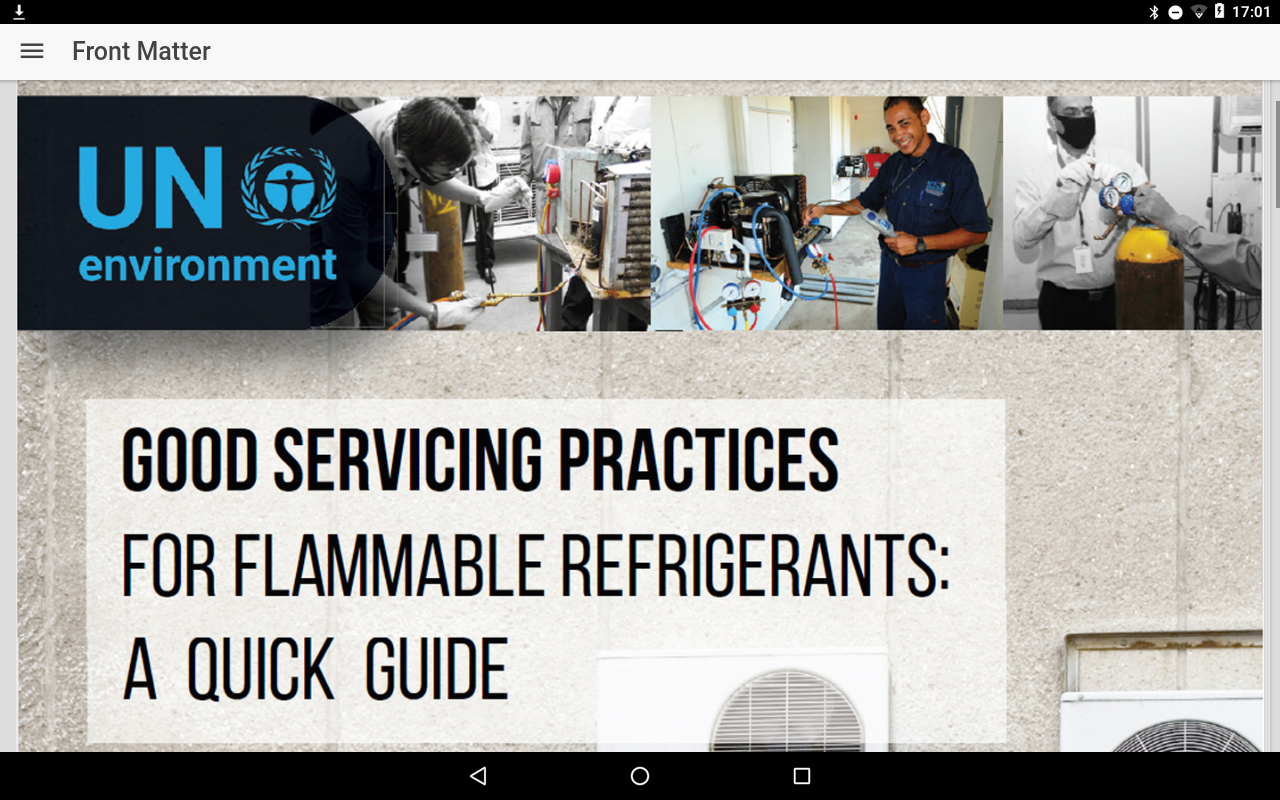 This is the electronic and interactive version of the UN Environment OzonAction Quick Guide on Good Servicing Practices for Flammable Refrigerants. It offers easy reference to the key safety classification and technical properties of flammable refrigerants that are available in the market. It also provides important safety guidance for the installation and servicing of room air-conditioners designed to use flammable refrigerants. This interactive guide allows you to scroll and browse the text, jump to specific chapters or use the comprehensive dynamic index to locate specific keywords, figures and tables.