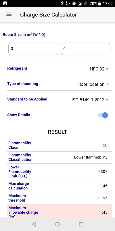 The application also includes a refrigerant charge size calculator and a room size calculator for flammable refrigerants.