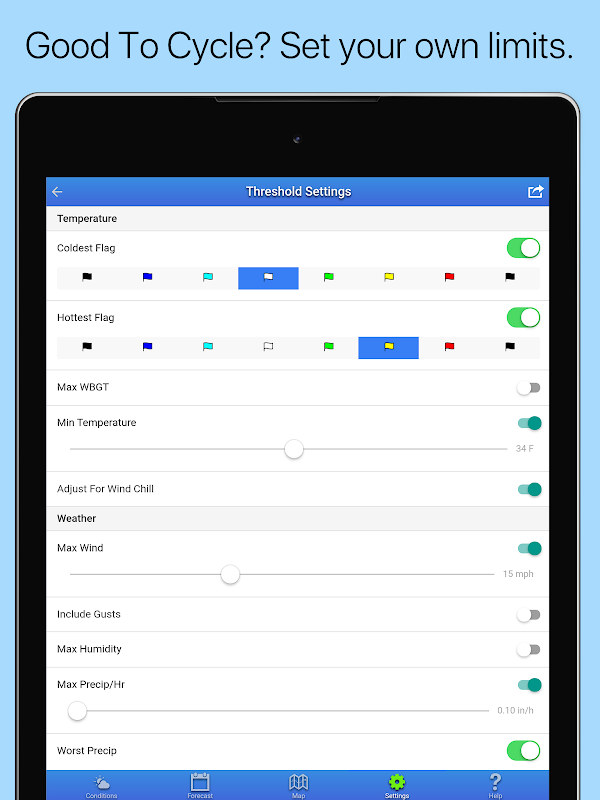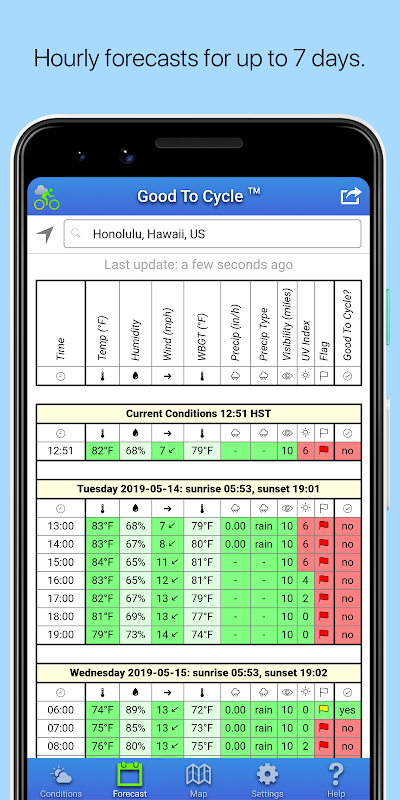 Weather forecasts, wet-bulb globe temperature, flags, and UV index, for cycling.
