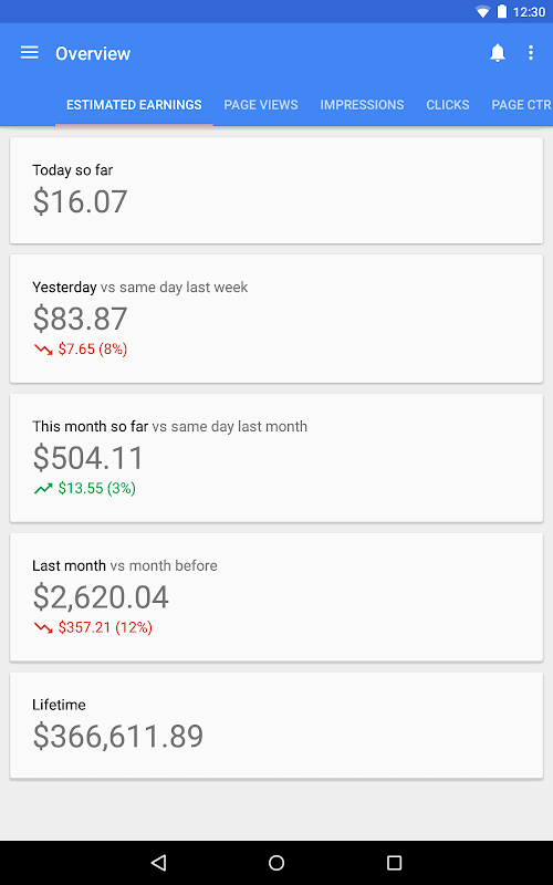 The Google AdSense app provides an easy way to view key data from your AdSense and AdMob accounts. It allows you to access reporting features anywhere, directly from your mobile device. The app provides you with an account overview, as well as access to detailed performance reports on all key metrics. Available reports include: top ad units, channels, sites, countries and more. The account earnings report is also accessible via a resizable widget.