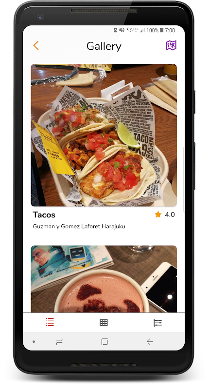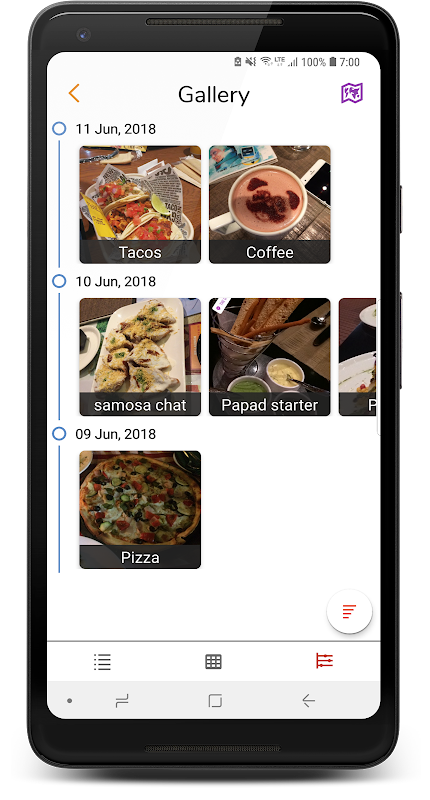 Visualize the dishes on Map and Gallery with grid, list and timeline view.