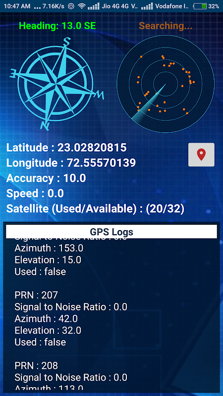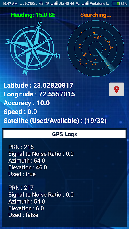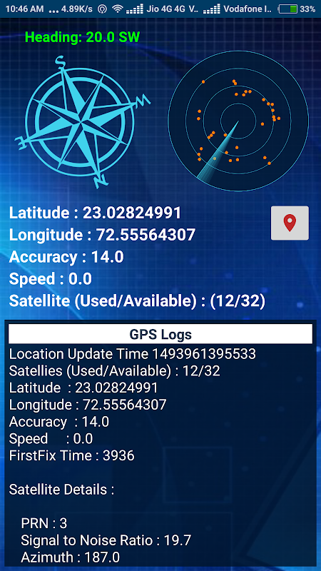 This Application shows GPS Longitude, Latitude, Satellite Information such as Azimuth, Elevation, Signal to Noise Ratio of Available Satellites and Compass Orientation