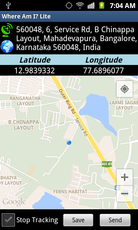 - Displays current location address, latitude, longitude and your position on map
