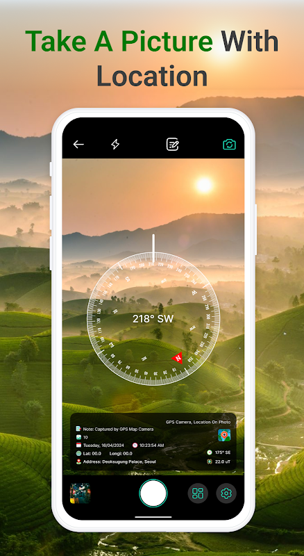 Capture photos with GPS camera to add location, date, timestamp. Live Earth Map.