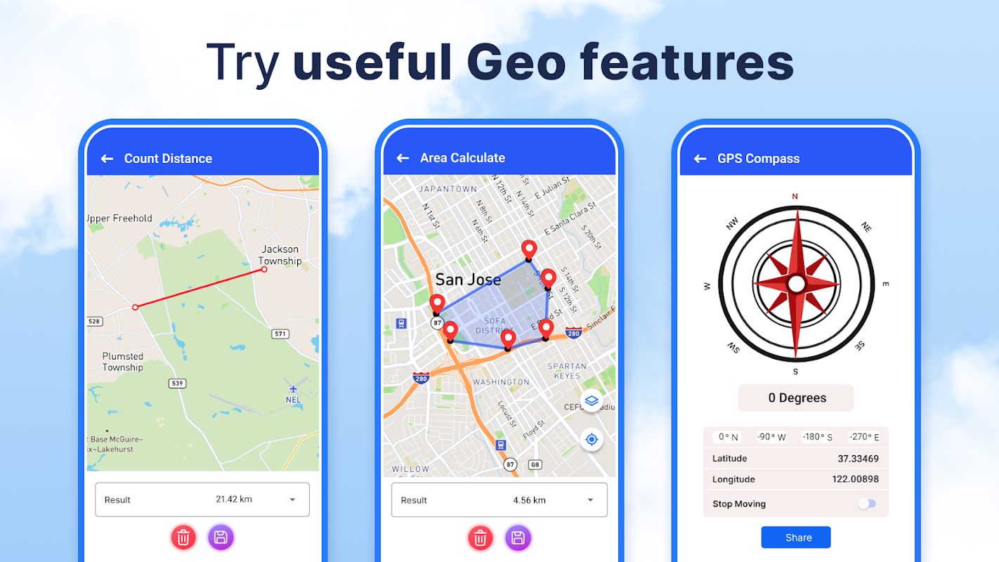 Discover places using GPS Navigation: Live Earth Map. Explore different landmarks, buildings, and terrains in sharp detail. Together with GPS With Voice Directions: Live Location App, an interactive map is available with great location precision and zooming features.