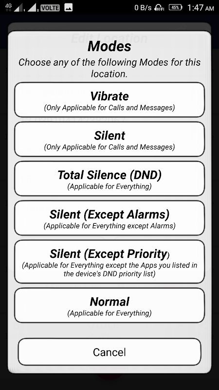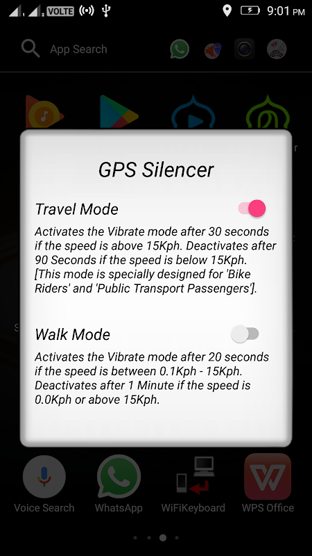 * 'Walk Mode' and 'Travel Mode' let the Bike riders and public transport passengers to put their phone in Vibrate mode automatically.