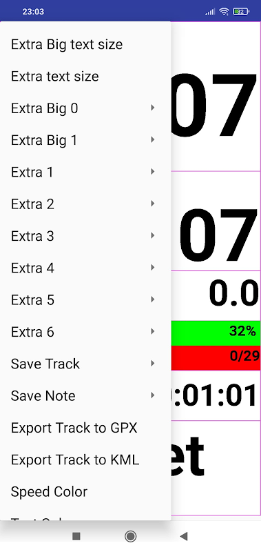 - Speed information, maximum speed, average speed, partial average speed, altitude, heading, sum of ascents, sum of descents, partial average speed, time, stopwatch, stopwatch with departure time, note number.