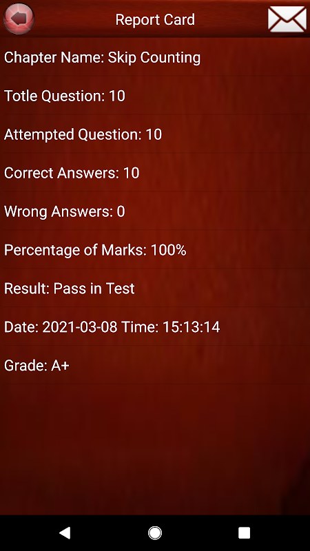 * Report Card: - After playing quizzes you can see your performance report card based on the grading system and also can mail your performance report to your teachers, parents, and friends.