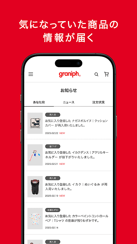 With the official Granif app, you can check new graphic items and the latest news released every week anytime, anywhere, such as on the go or on the train. Please look for your favorite from various graphic items.