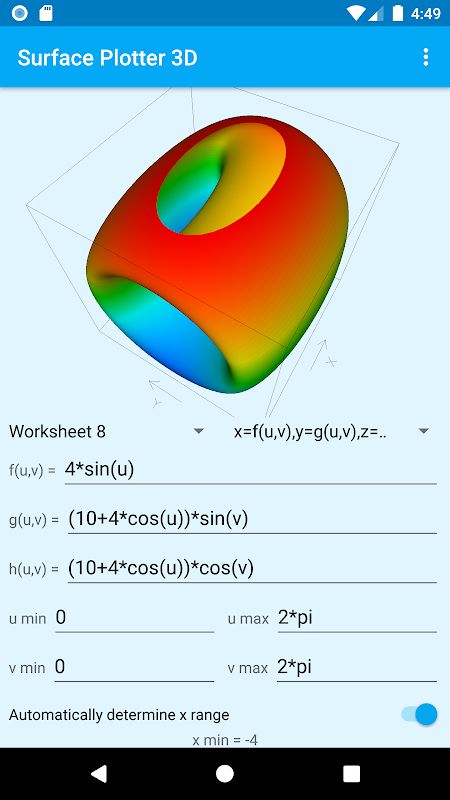 Everything entered on up to 10 worksheets is automatically saved, so you can define up to 60 plots (6 types per worksheet) and know they will be exactly the same next time you use the application. When you use the application for the first time you will notice that we have provided 60 samples for you to experiment with. Obviously these samples will be lost once you start to enter your own functions but they can be restored at any time by going into Android Settings and deleting the application’s data. Take care doing this because you will also lose any functions you have defined yourself.