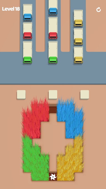 Harvest red, blue, green grass and push it into the same-colored truck to win.