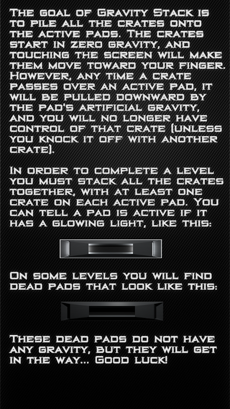 Touching the screen anywhere will cause the crates to move toward your finger. If a crate passes over a pad it will "turn off" and fall onto the pad. To beat a level you must stack all the crates on the pads, with at least one crate on each pad. It may seem simple at first, but the difficulty increases dramatically as you progress... Good luck!