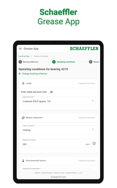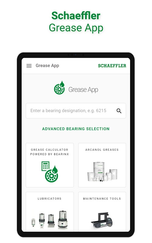 With just a few clicks and entries in the intuitive Schaeffler Grease App you can quickly determine the most suitable type of Arcanol grease, the grease service life, the relubrication interval and the lubricant quantity for initial lubrication and relubrication of your bearings. This way you can avoid over- or undergreasing, incorrect intervals and unsuitable lubricant selection. You also make an important contribution to more sustainable lubrication.