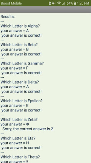 This app is about helping kids understand the Greek Alphabet. So when you have to learn the Greek alphabet for a pop quiz or unit test, this app fits perfectly for those purposes. Not only just learning the Greek alphabet for test, you could also learn it for yourself. This app is laid out in a test like format to help kids better understand. Also all you have to do is click begin, and from there you can choose from four different answer choices for each question.