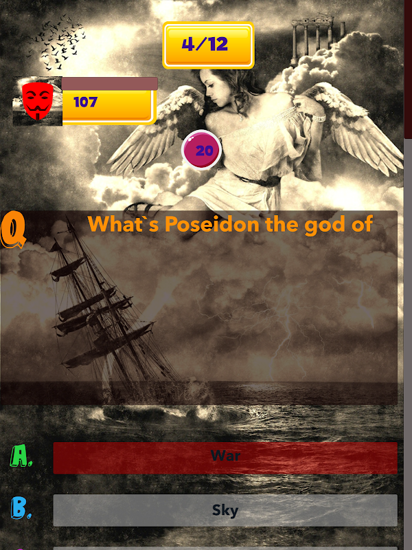 This Greek Mythology game helps user to sharpening their knowledge and senses, help them to prepare for exams or tests which are based on all Aspects of Greece Mythology and helps them to increase their knowledge. This app targets people of all ages, even children could enjoy tests created by this app and could enhance their Greeks gods and goddesses Mythology Knowledge. This app can be used for the preparation of School, Collage and Universities quizzes and also for entry tests. This app contains cool features like coloring buttons green if the answer is correct otherwise colored it red because the answer is wrong. It contains good graphics and less Ads. This app is extremely efficient, it is developed in such a way so that it could run smoothly in any device.