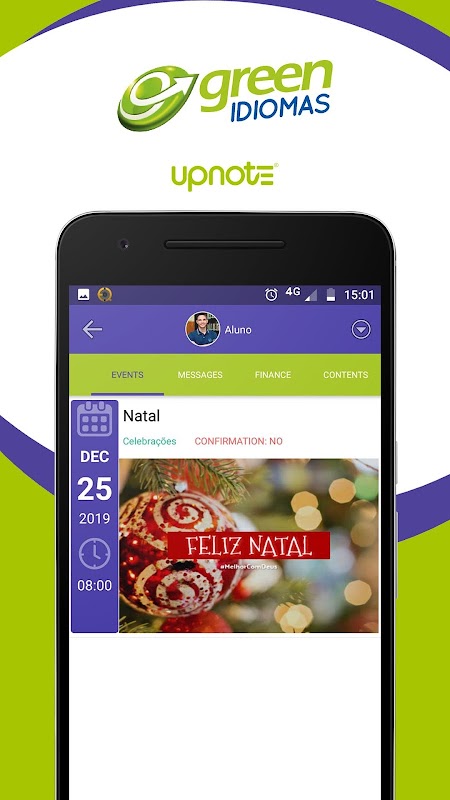 O aplicativo do Green Idiomas reúne todas as informações para manter professores, alunos e responsáveis informados sobre o calendário, eventos e demais notificações da escola.