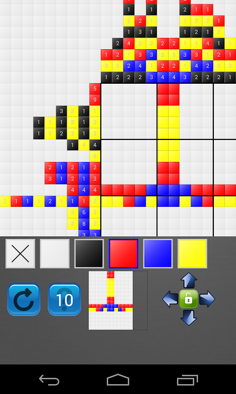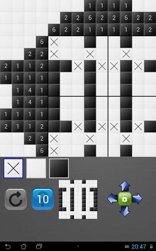 - in this puzzle game marking empty fields is as important as marking the full fields. Marking empty fields helps to solve diagram. Often without selecting empty fields nonogram can not be resolved.