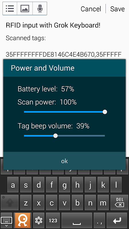 With this Android soft-keyboard and an attached U Grok It RFID reader, it is possible to scan and enter RFID tag EPCs with arbitrary apps. A special key on this keyboard starts the RFID scanning system, and scanned EPCs are automatically entered into the current text field of a target app. To the app, the EPC appears as if it were entered manually. Modifications of the target app are not required for this purpose.