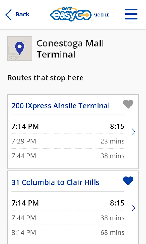 The official GRT easyGO mobile application is a free interactive tool for Waterloo Region riders to have instant access to Grand River Transit real-time bus information. Bus arrival times, bus geolocations, route information, live news feeds, and links to our mobile trip planner and detour information are all features included in the mobile application.